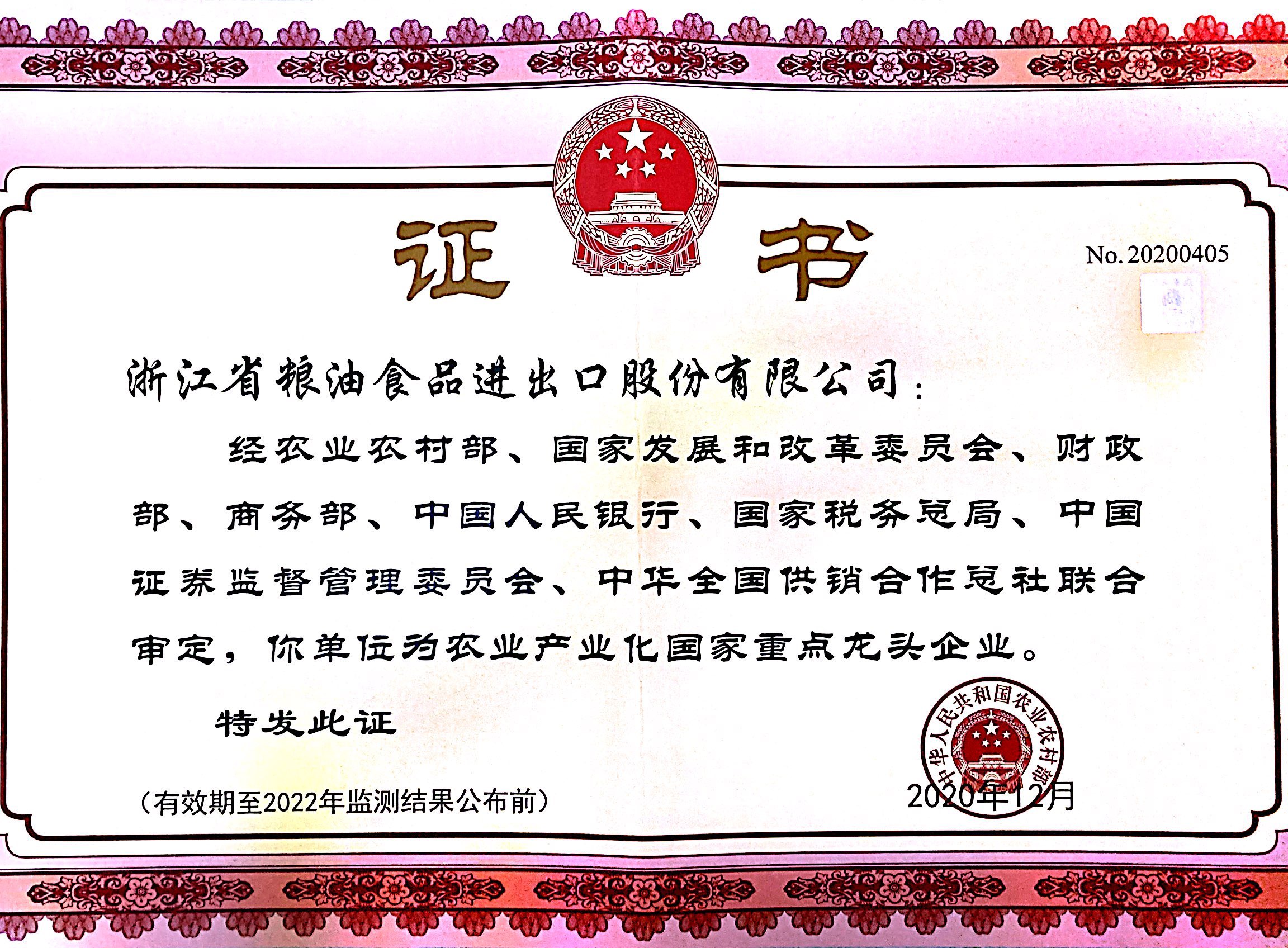 公司與寧波天韻公司通過第九次農(nóng)業(yè)產(chǎn)業(yè)化國家重點(diǎn)龍頭企業(yè)監(jiān)測(cè)復(fù)評(píng)